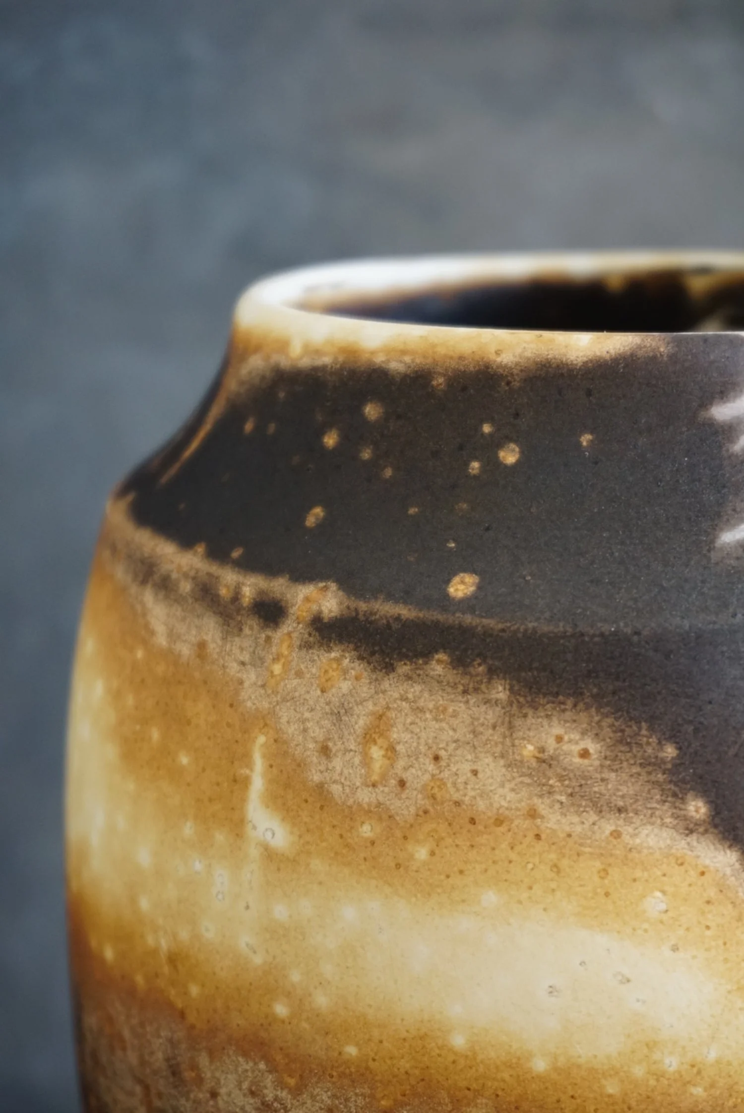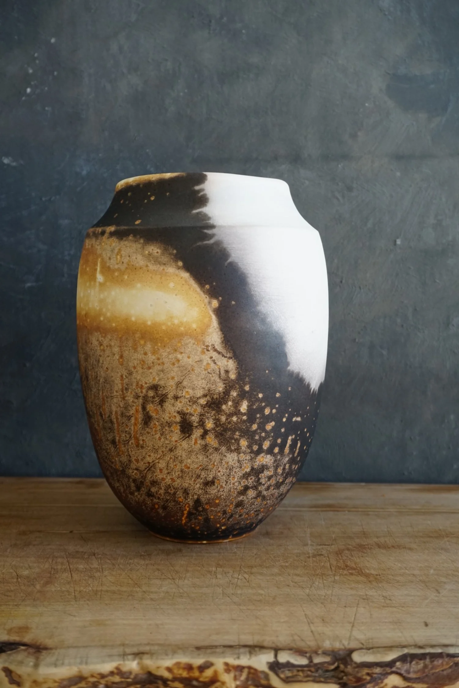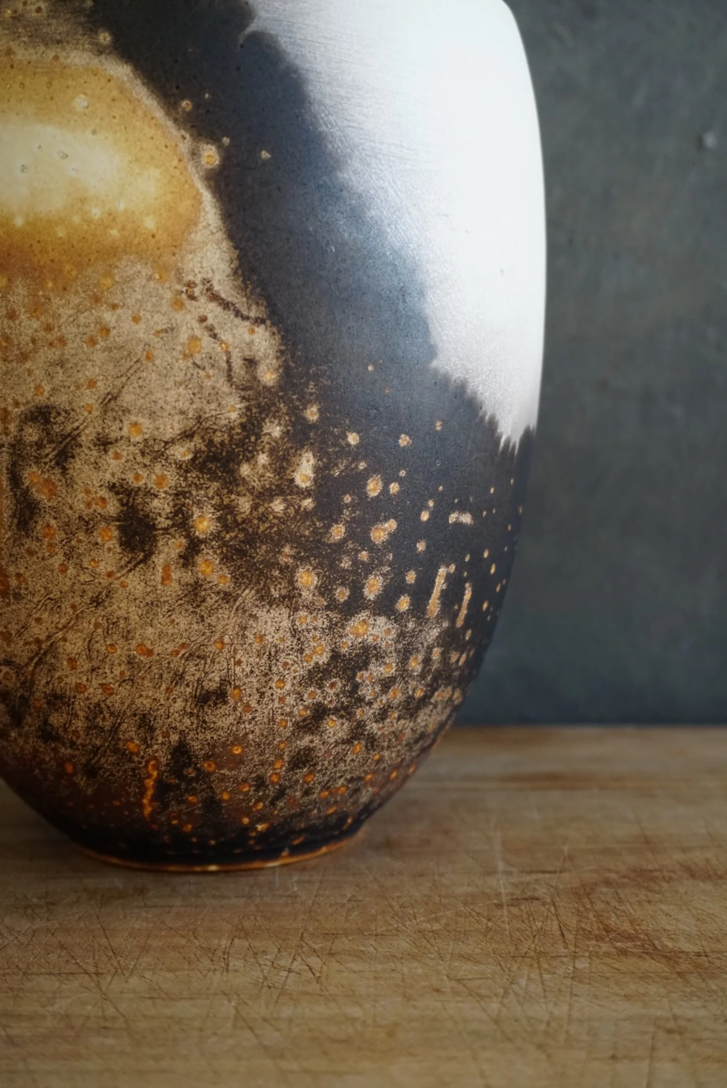 Covered obvara jar with toasty browns with sprinkles of whites spots on its surface. With its softly curved silhouette and bold surface markings, this piece feels both grounded and ethereal—like a vessel forged by fire and time. Size 6.5 in x 6.5 in